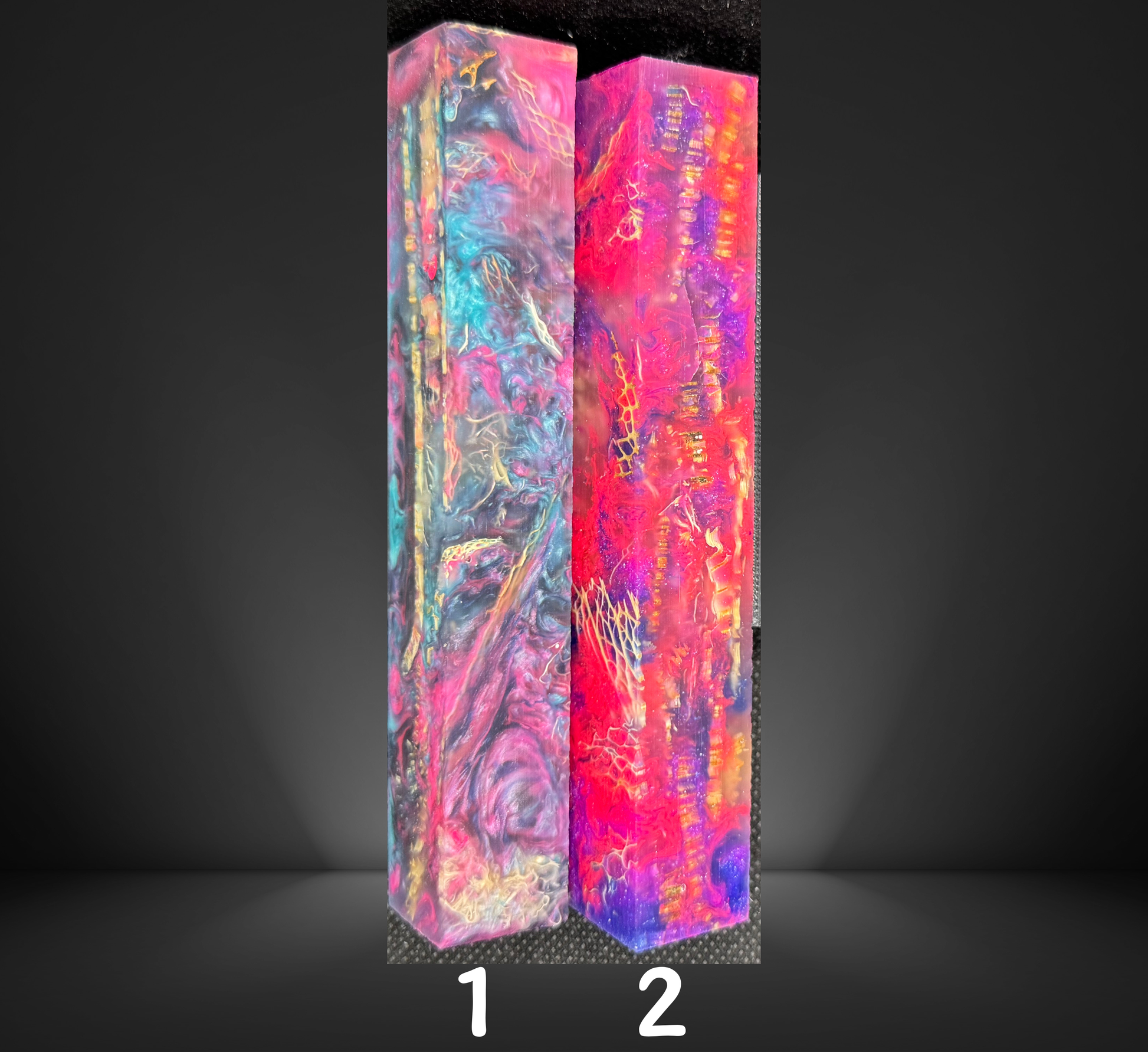Colors may vary slightly due to lighting, screen display, and the polishing process; finished pens often appear more vibrant than raw blanks. Swirl patterns and 3D printed details may differ once turned, as inner resin layers and design edges change during shaping.