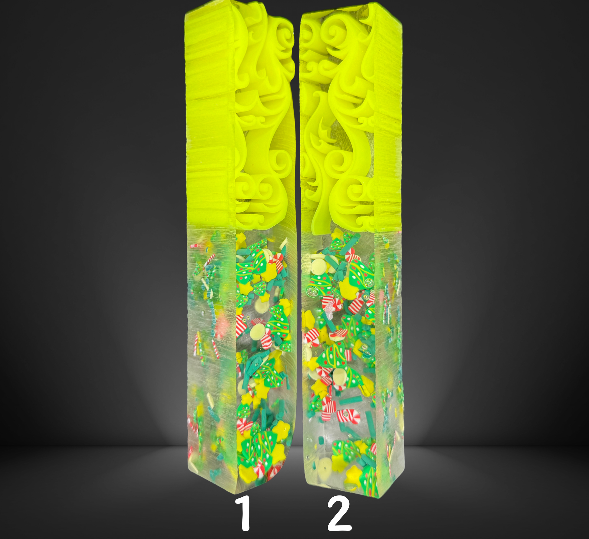 Blanks measure approximately 5.5"X.88"X.88" and are made with Alumilite Clear resin. This blank is made with resin 3d prints.