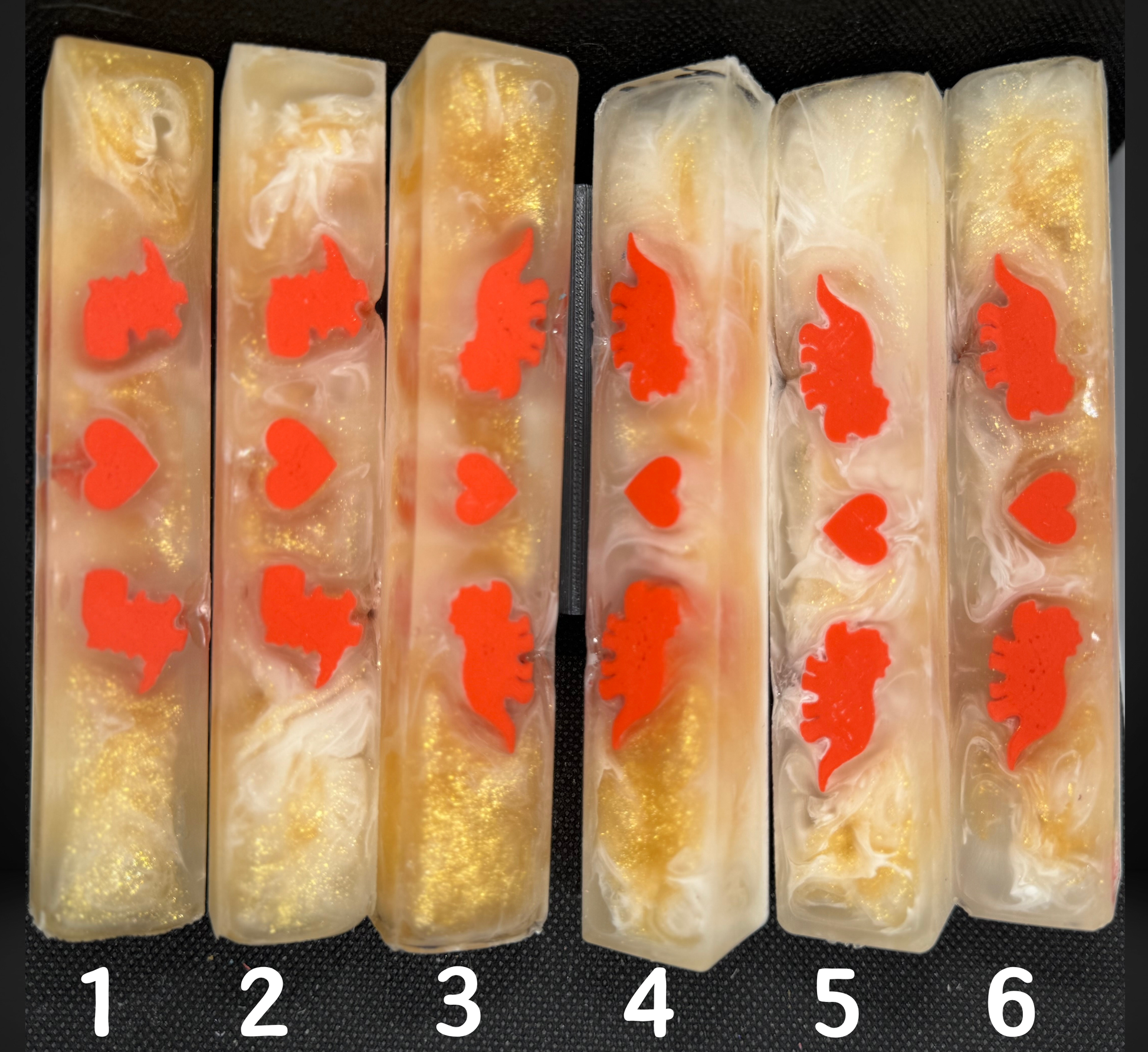 Blanks measure approximately 5.5"X.88"X.88" and are made with Alumilite Clear resin. This 3D print was made with PLA.
