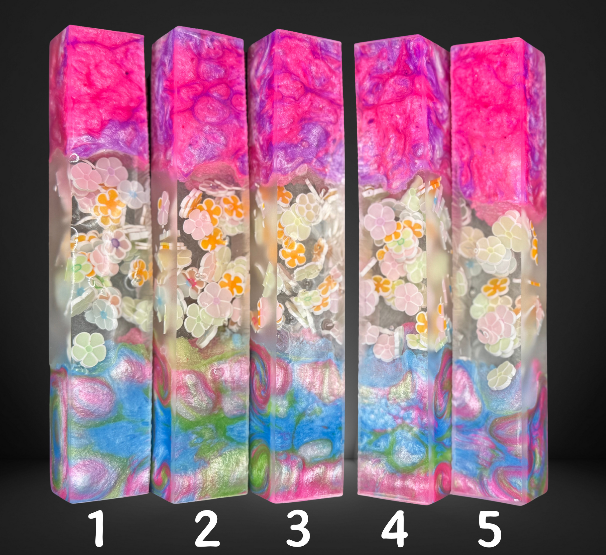 Blanks measure approximately 5.5"X.88"X.88" and are made with Alumilite Clear resin. Clay slice flowers glow in the dark
