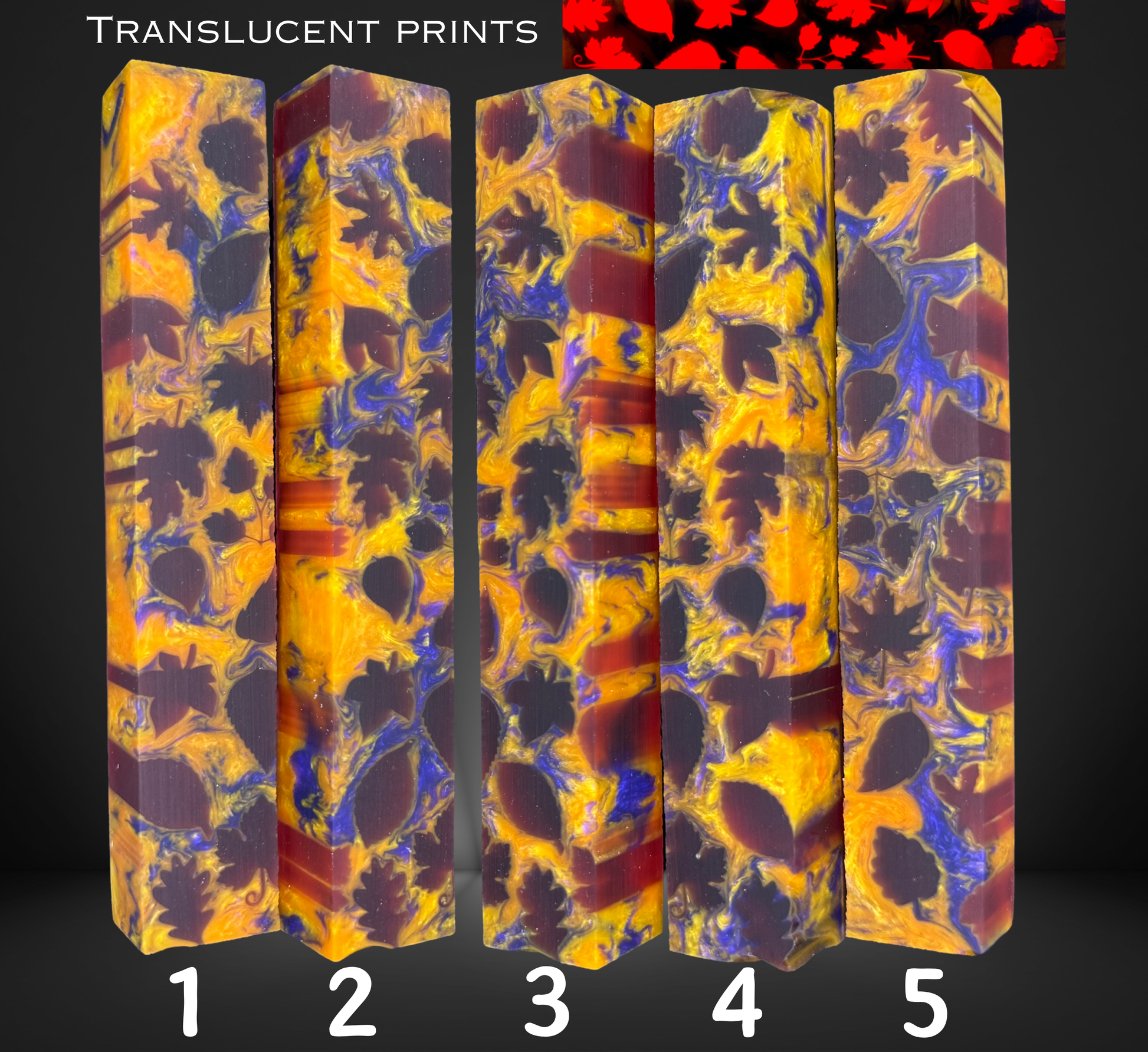 Colors may vary slightly due to lighting, screen display, and the polishing process; finished pens often appear more vibrant than raw blanks. Swirl patterns and 3D printed details may differ once turned, as inner resin layers and design edges change during shaping. 3D printed blanks require slow, gentle turning to prevent delamination.